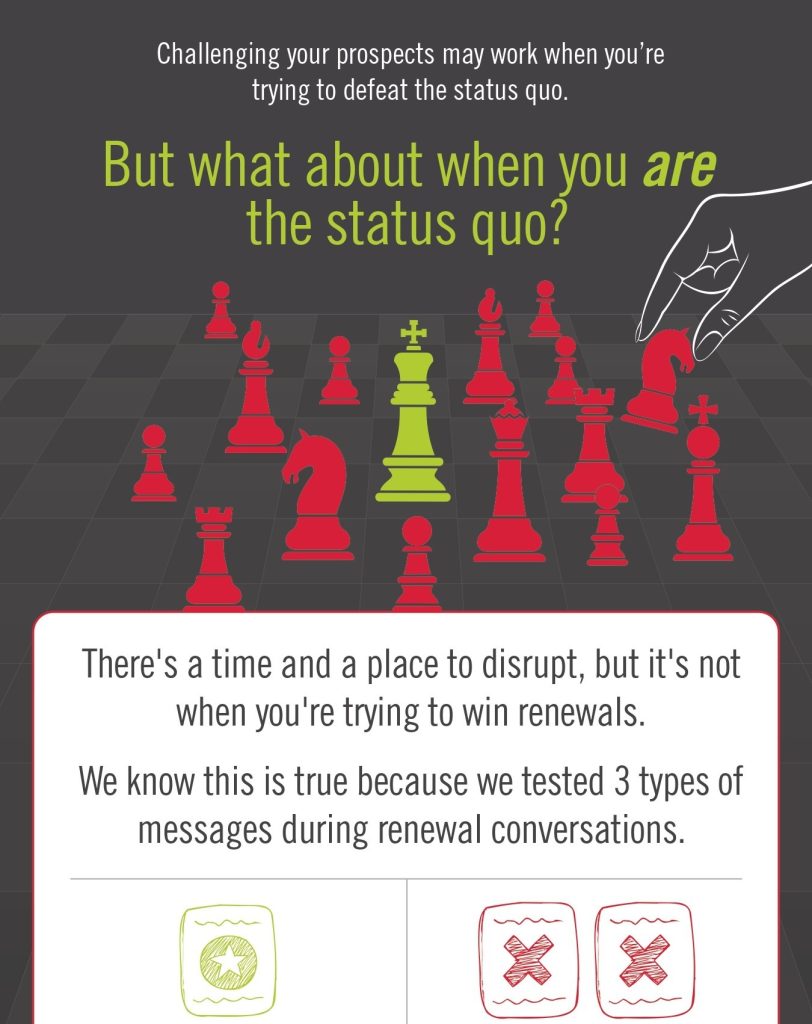 However, when crafting a message for current customers, adopting a disruptive and challenging approach will be counterproductive, as it increases the likelihood of your customer switching providers by 10%.